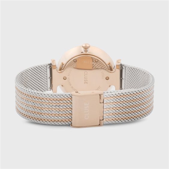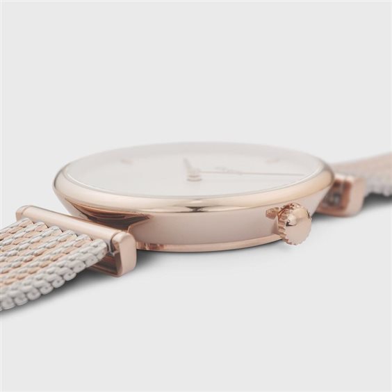 Orologio Triomphe Mesh Bicolour Eleganza essenziale che riequilibra gli elementi ridefinendo le regole dell'abbinamento. Strisce in oro rosa e argento si fanno strada con elegante disinvoltura e un affascinante bagliore lungo il cinturino a maglie. Il dettaglio rappresentato dalla barretta a T dà vita a un profilo elegante completato dal quadrante scintillante delicatamente metallizzato che cattura la luce e attira gli sguardi. Completo di sacchetto in similpelle grigia.