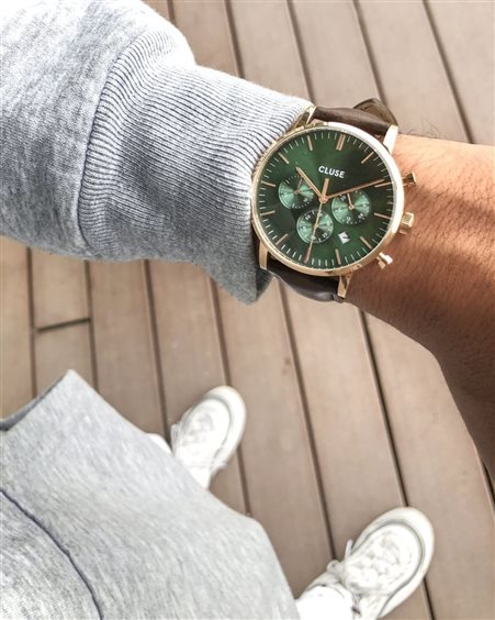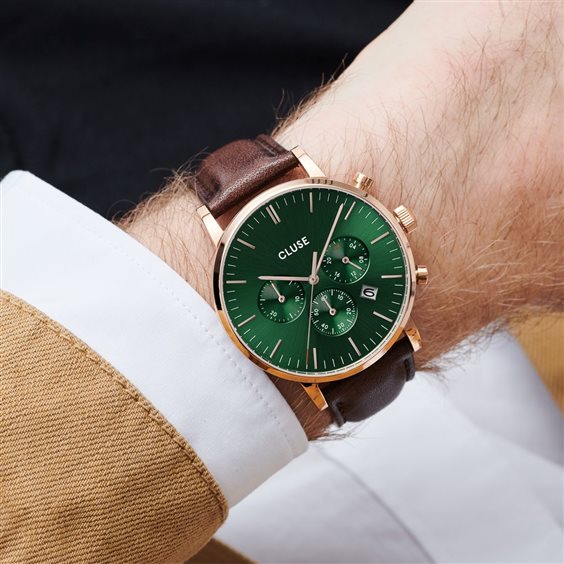 Acciaio inossidabile e raffinato minimalismo sono le peculiarità della nostra collezione Aravis per uomo. Cronografo a tre contatori dal design moderno, con quadrante di colore verde e datario. Perfetto da indossare tutti i giorni. Le tonalità intense del marrone e del verde sono sottolineate dall’oro rosa e da eleganti dettagli in rosso quasi impercettibili. Impermeabilità: 5 ATM.