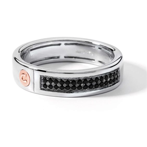 Anello uomo in argento, 18 kt rosè gold e spinelli nere. Misura 23