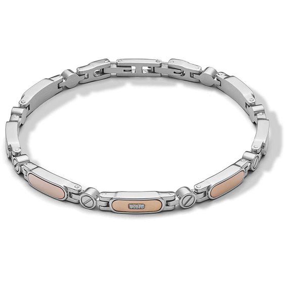 Bracciale da uomo di Comete in acciaio lucido, Pvd Rosè e diamanti bianchi per carati totali 0,015 della collezione Elegant. Lunghezza standard a 21Cm, riducibile grazie alla doppia chiusura a 19,5Cm.