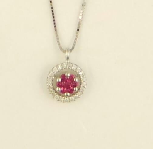 Girocollo Comete oro bianco 18Kt, con ciondolo di diamanti taglio brillante e rubini. Domensioni ciondolo 1cm