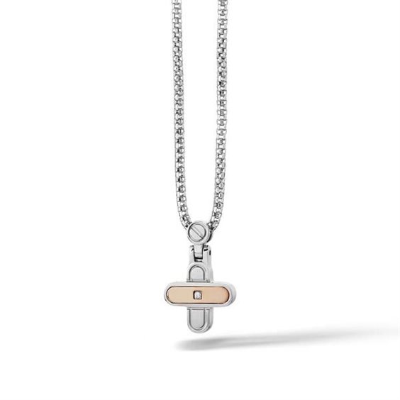 Collana uomo Comete UGL 700 Collezione Elegant maglia in acciaio con pendente croce lucida con pvd oro rosa sul braccio orizzontale ed impreziosita da un diamante di Ct. 0,005. Chiusura a moschettone. Lunghezza 50 cm.