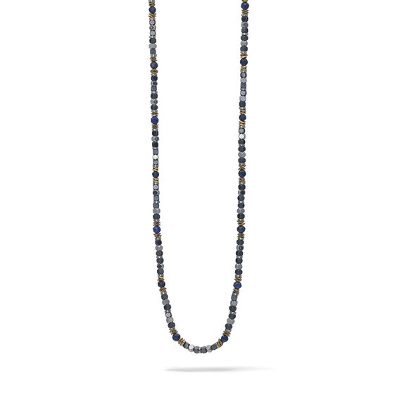 Girocollo in acciaio lucido, ematite nera ed ematite con trattamento oro. Pietre lapis