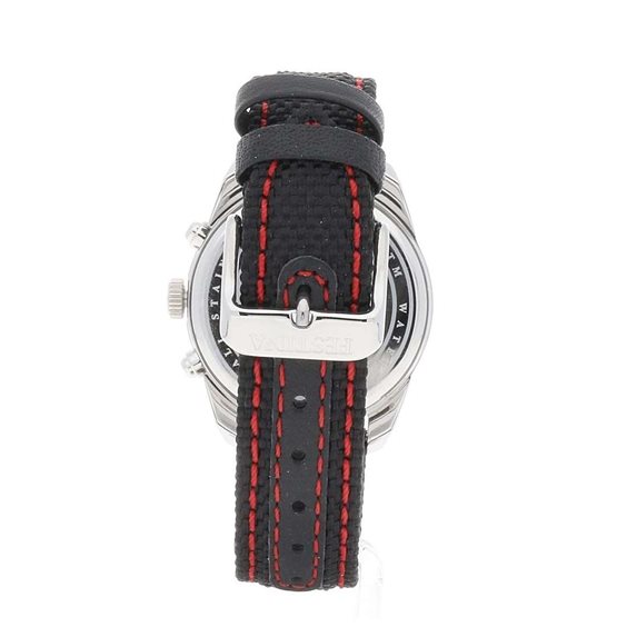 Orologio Festina bimbo. Cassa mm 36 in acciaio 316L, cinturino in pelle e tessuto tecnico nero con cuciture rosse. Quadrante nero con numeri arabi argento. Movimento multifunzione al quarzo, vetro minerale. Impermeabilità 5 atmosfere.