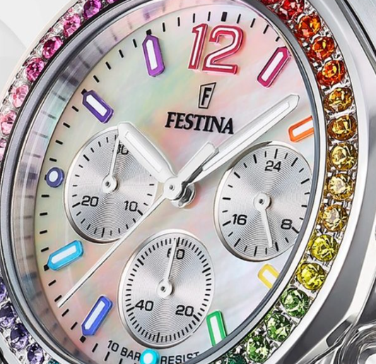 Orologio Festina Boyfriend. Cassa (mm 38) e cinturino in acciaio 316L. Ghiera pietre arcobaleno. Quadrante madreperla con dettagli arcobaleno. Cronografo al quarzo, vetro minerale. Impermeabilità 10 atmosfere.
