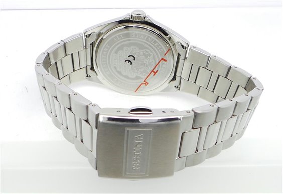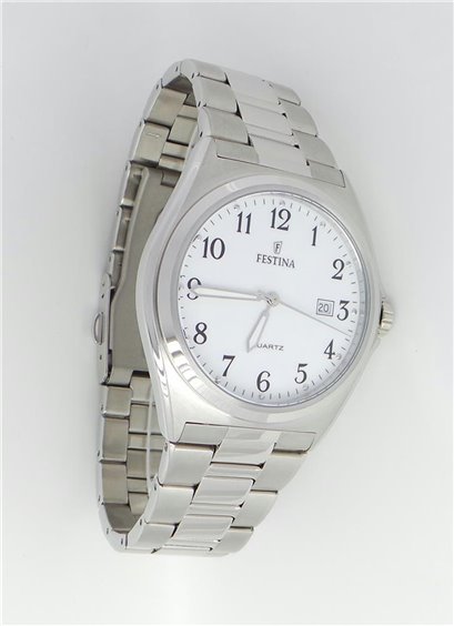 Orologio Festina. Cassa (mm 40) e cinturino in acciaio 316L. Quadrante bianco con numeri arabi neri stampati, lancette visibili al buio e datario al 3. Vetro minerale. Impermeabilità 5 atmosfere.