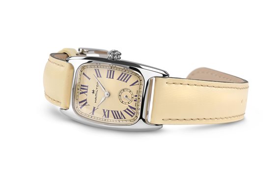 Hamilton Boulton Small Second H13321821 Con una cassa dalla forma curvata ad arte e un design Art Déco distintivo, l'Hamilton Boulton M è ora disponibile in colori audaci ispirati ai classici sapori macro. Il bellissimo quadrante beige vaniglia dell'orologio è completato da numeri romani in viola lavanda e completato da un cinturino in pelle per completare il look. Esplorando una tavolozza di deliziose combinazioni di colori, l'Hamilton Boulton è un'allettante dolcezza per il polso. Unendo perfettamente vecchio e nuovo, questo orologio trasuda un tocco femminile fresco e senza tempo. L' orologio da donna Hamilton American Classic Boulton Small Second Quartz M H13321821 offre un design classico che lo rende un accessorio adatto a una camicia o un vestito. Tuttavia, la sua intramontabilità lo rende l'accessorio perfetto per tutti i giorni. Il quadrante dettagliato è protetto da un vetro zaffiro. Il vetro zaffiro è un grande vantaggio negli orologi in quanto è quasi impossibile da graffiare. La cassa dell'orologio è realizzata in acciaio inossidabile e l'orologio rimane sulla mano grazie a un cinturino in pelle rosa chiaro ben realizzato con una fibbia a spina d'argento. L'orologio è alimentato da un movimento al quarzo svizzero ETA 980.163. Il quadrante, in particolare la lancetta dei secondi decentrata in posizione ore 6, è inconfondibile e la caratteristica principale oltre alla cassa rettangolare con piedini dal design non convenzionale. La resistenza all'acqua di questo modello è di 50 m (5 ATM) e può resistere al contatto con l'acqua durante la pioggia e il lavaggio delle mani o la doccia. Tuttavia, a causa del cinturino in pelle, non consigliamo di esporre l'orologio all'acqua.
