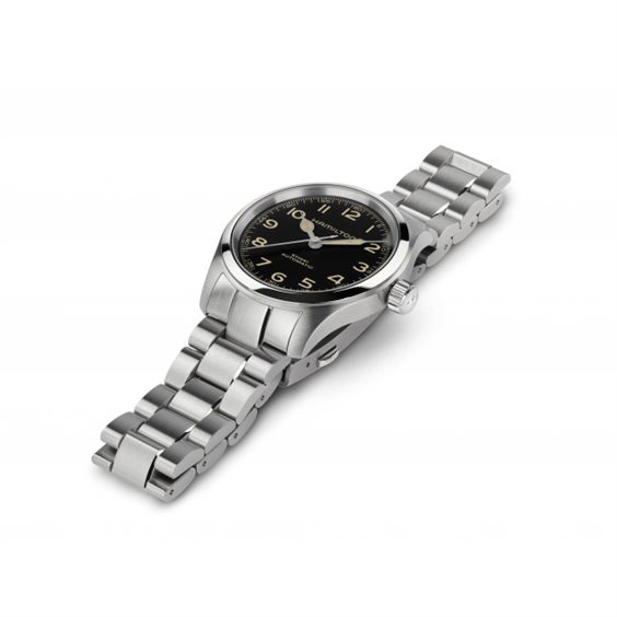 Uno degli orologi più famosi del grande schermo, noto tra i fan come "The Murph", viene presentato in una nuova versione braccialata con una cassa compatta in acciaio inossidabile da 38 mm. Caratterizzato da un quadrante nero, sul quale si stagliano numeri leggermente bombati, per una leggibilità ottimale, e sfere a forma di cattedrale, che gli conferiscono un tocco vintage. L'originale versione da 38 mm è ora disponibile con un bracciale in metallo spazzolato a 3 maglie per maggiore durabilità e versatilità, che saprà soddisfare tanto gli amanti di Hamilton quanto quelli di Hollywood. All'interno della cassa, il movimento meccanico svizzero Hamilton H-10 (basato sull'ETA C07.611 costruito sull'ETA 2824-2) ticchetta in modo affidabile con carica automatica. Funziona a una frequenza di 21.600 semi-frequenze all'ora, ha 25 rubini e, cosa più importante, una riserva di carica estesa di 80 ore. La macchina ha anche una funzione di "hacking" e la possibilità di carica manuale della corona. Il modello si distingue per l'eccellente leggibilità e la facile chiarezza, richieste negli orologi militari. Il quadrante è protetto da un vetro zaffiro con trattamento antiriflesso . Il vetro zaffiro è un grande vantaggio negli orologi in quanto è quasi impossibile da graffiare. Lo strato antiriflesso garantisce un'ottima leggibilità anche sotto la luce solare intensa. Le lancette e i numeri sono rivestiti con un composto luminescente Superluminova , che garantisce una luminosità più duratura. Il diametro della cassa di 38 mm lo rende adatto sia ai polsi più piccoli degli uomini che a quelli più grandi delle donne. La resistenza all'acqua dell'orologio è di 100 m (10 ATM) , quindi può sopportare un contatto con l'acqua ancora maggiore, come il nuoto. E perché l'orologio si chiama "Murph"? Perché questo modello, ma nella misura originale 42 mm (rif. H70605731 ), è stato indossato al polso da un personaggio di nome Murph nel famosissimo film americano Interstellar.