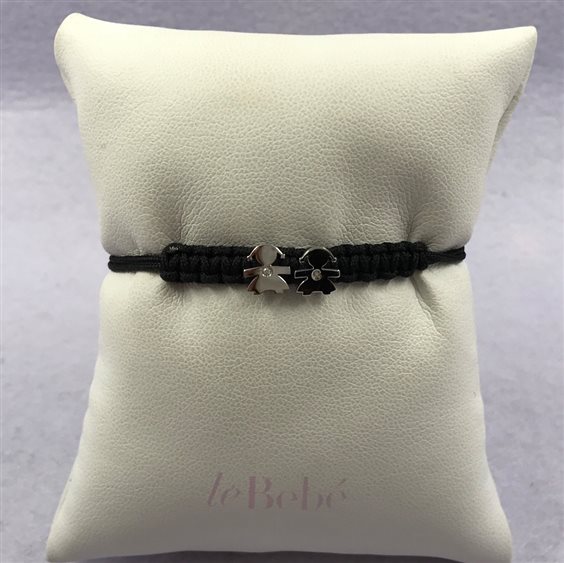 Bracciale in cordino nautico nero con ciondolo sagoma femminuccia in oro bianco con brillante ct.0,003. Le sfere e la targhetta sono in argento 925. Tutti i gioielli della linea le Bebé possono essere personalizzati.