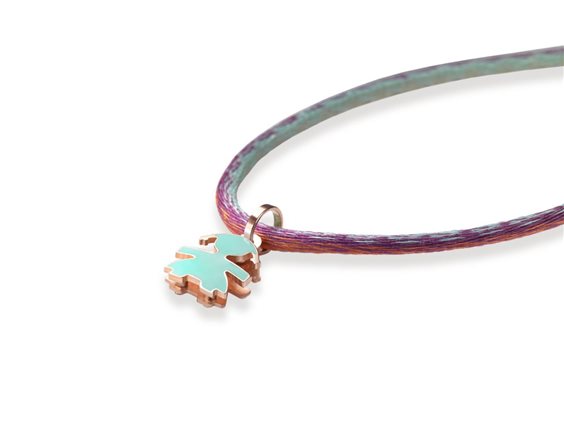 Ciondolo bombato Bimba in Oro Rosa 9 Kt e smalto color tiffany, con cordino degradè regolabile di 80 cm. Altezza: 1 cm Larghezza: 0,90 cm