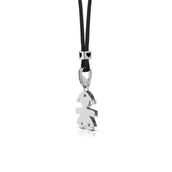 Ciondolo con sagoma femminuccia in oro bianco , altezza 1,40 cm. larghezza 1,20 cm., cordino color nero e distanziatore in oro bianco con cuoricino traforato. Tutti i gioielli della linea le Bebé possono essere personalizzati.