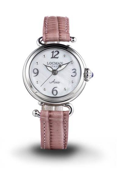 Orologio da donna della collezione "Amo". Un orologio dalla linea elegante e pulita, che grazie al suo particolare design, ispirato agli ami dei pescatori, ricorda il forte legame del brand con il mare. Movimento Solo Tempo al Quarzo, Cassa in acciaio con fondello in titanio, numeri arabi e indici applicati su un elegante quadrante in madreperla bianca, il tutto racchiuso da un vetro minerale antigraffio trattamento zaffiro. Impermeabilità 5ATM. La corona è decorata con un piccolo cabochon in vetro di colore blu profondo.