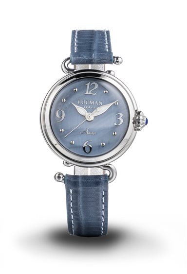 Orologio da donna della collezione "Amo". Un orologio dalla linea elegante e pulita, che grazie al suo particolare design, ispirato agli ami dei pescatori, ricorda il forte legame del brand con il mare. Movimento Solo Tempo al Quarzo, Cassa in acciaio con fondello in titanio, numeri arabi e indici applicati su un elegante quadrante in madreperla azzurra, il tutto racchiuso da un vetro minerale antigraffio trattamento zaffiro. Impermeabilità 5ATM. La corona è decorata con un piccolo cabochon in vetro di colore blu profondo.