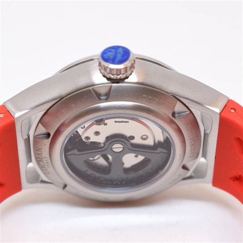 Orologio Locman Montecristo. Cassa mm 40 in titanio, cinturino in silicone rosso con chiusura a farfalla e doppio pulsante. Quadrante nero con numeri arabi bianchi stampati, dettagli rossi, datario al 3. Movimento automatico S.I.O. a vista, bilanciere brunito. Vetro minerale trattamento zaffiro. Fondello trasparente a vite, corona a vite. Impermeabilità 20 atmosfere. MADE IN ITALY