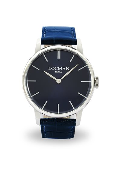 Orologio unisex , movimento al quarzo , solo tempo , cassa mm 40 , quadrante blu , indici incollati , fondello in titanio a pressione , numero seriale di produzione inciso sul fondo , vetro con trattamento zaffiro , cinturino in pelle stampata blu. Immagine indicativa , la confezione può variare di forma e colore.