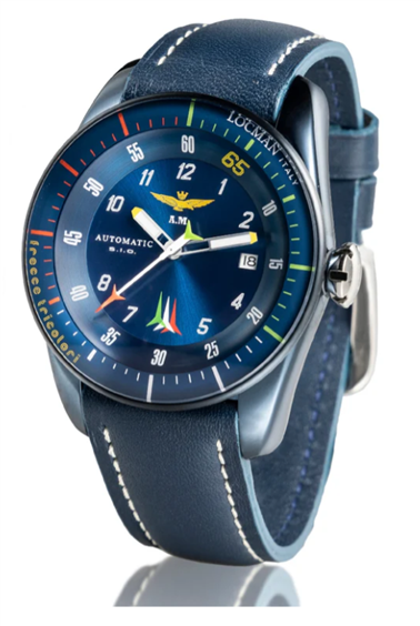 Orologio Locman Aviatore. Realizzato in occasione del 65° anno acrobatico delle Frecce Tricolori. Cassa mm 44 PVD blu, cinturino in pelle blu con cuciture bianche, chiusura fibbia ardiglione. Quadrante blu con dettagli che richiamano alla storia delle Frecce Tricolori, stemma Aeronautica Militare e delle Frecce e un 65 all'1. Indici tricolore, lancetta dei secondi a somiglianza delle frecce dl logo. Fondello a in vetro e titanio, logo Frecce Tricolori, scritta "LIMITED EDITION" , la produzione è limitata e numerata, il numero si trova inciso sul fondello. Movimento automatico S.I.O., bilanciere blu. MADE IN ITALY