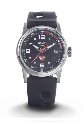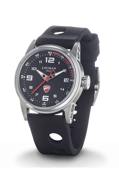 Orologio Locman Ducati. Cassa mm 50 in acciaio, fondello in titanio. Cinturino in silicone nero con fori, chiusura a fibbia. Quadrante nero con indici stampati bianchi e dettagli rossi, datario al 3, logo Ducati al 6. Movimento solo tempo al quarzo. Vetro minerale antigraffio, trattamento zaffiro. Impermeabilità 5 atmosfere. MADE IN ITALY