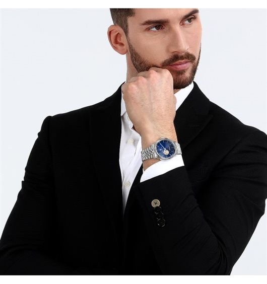 Orologio da uomo con movimento automatico Seiko NH70 con rotore personalizzato e funzione di solo tempo. Cassa in acciaio inox dal diametro di 42 mm. Corona a vite per garantire maggiore impermeabilità. Fondello a vite con movimento a vista. Quadrante analogico blu con movimento a vista, indici a bastoni e logo nella parte alta. Cinturino jubilee in acciaio anallergico; chiusura deployante con pulsanti. Resistente all'acqua fino a 100 metri di profondità.