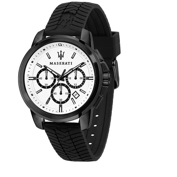 Prodotto: orologio cronografo uomo Maserati Successo R8871621010 Orologio Cronografo Da Uomo Di Maserati Della Collezione Successo . L'Orologio È Realizzato In Acciaio E Silicone, Con Cassa Rotonda Realizzata Con Finitura Lucida E Satinata. Il Cinturino È Realizzato In Silicone Di Colore Nero Con Chiusura Fibbia Ardiglione. Il Quadrante È Di Colore Argento Bianco Brillante Con Vetro Minerale. Il Movimento È Al Quarzo. La Resistenza All'Acqua È Di 5 Atm. La Referenza È R8871621010 Questo cronografo verrà spedito con Scatola Originale Maserati