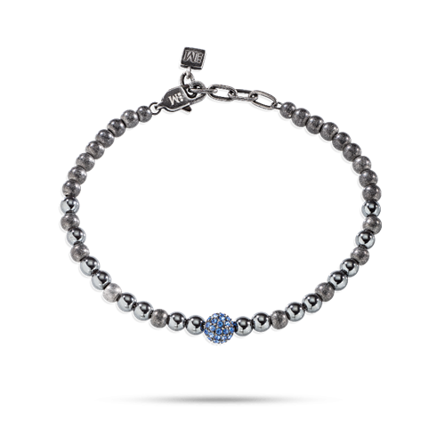 Bracciale uomo in acciaio brunito 316L , catena maglia rolò , lunghezza cm 20 con messa a misura fino a cm 18 , sfere in ematite lucide e satinate , sfera centrale da mm 5 con cristalli blu incassati.Immagine indicativa , la confezione può variare di forma e colore.