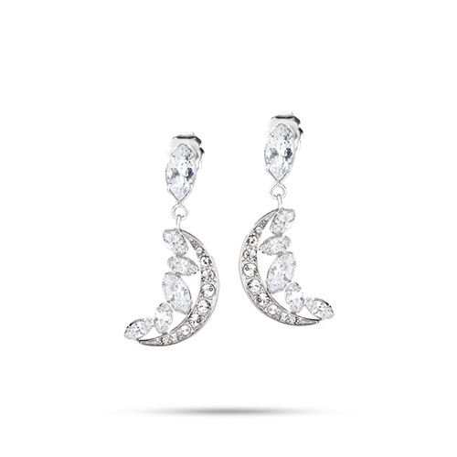 ORECCHINI DONNA COLLEZIONE LUNA IN ACCIAIO RODIATO IN ARGENTO. SONO A FORMA DI LUNA RICOPERTI DA CRISTALLI BIANCHI. Lunghezza cm 2,5. Immagine indicativa , la confezione può variare di forma e colore.