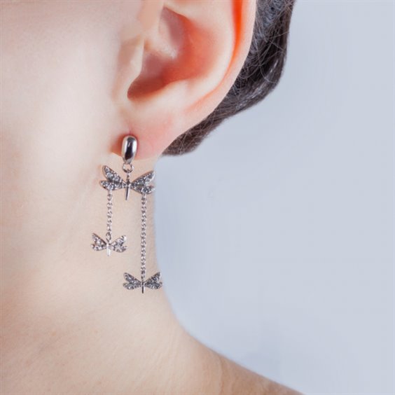 Orecchini donna in acciaio 316L, pendenti con cristalli bianchi. Perno e farfallina in acciaio , lunghezza cm 4. Immagine indicativa , la confezione può variare di forma e colore.