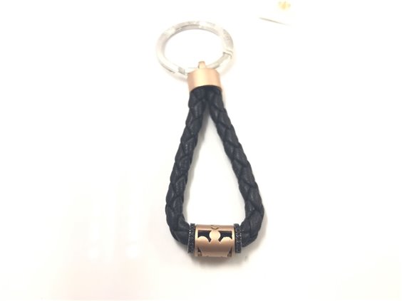 Portachiavi in argento e cuoio con elemento in argento rosè satinato a forma di cilindro con angeli. L'elemento è tra due anellini con zirconi neri.