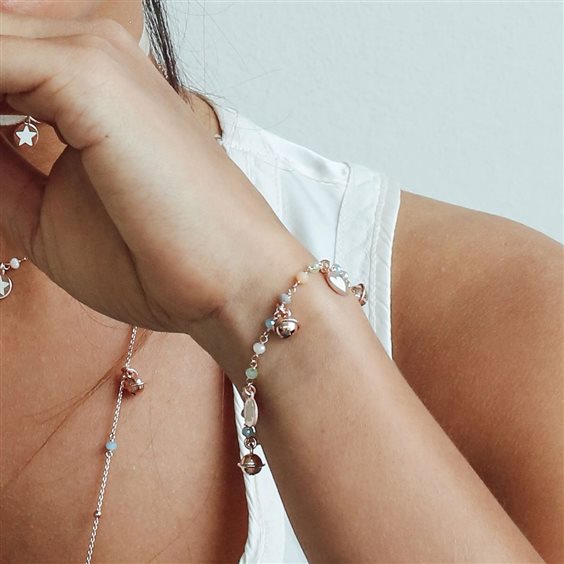 Bracciale incatenato pietre miste pastello, 3 medagliette e 4 campanelllini Soggetti medagliette: cuore, stella, quadrifoglio Finitura disponibile: Placcatura oro rosa 18kt Materiale: Argento 925 Taglia: Unica 17 cm + 3 cm