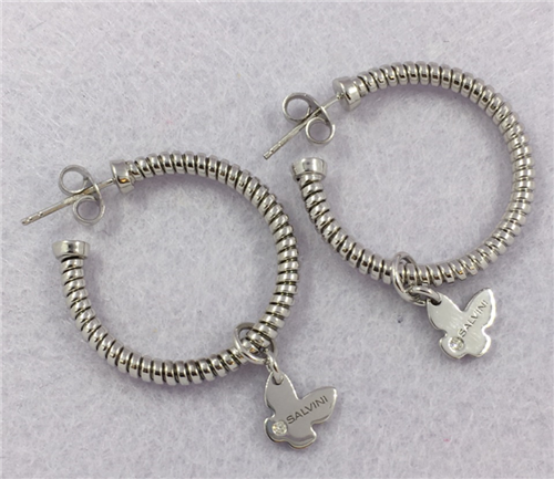 Orecchini a cerchio in oro bianco 9 k con piccolo pendente a forma di farfalla.
