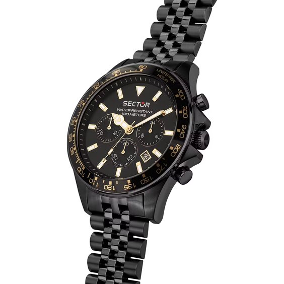 OROLOGIO SECTOR 230 - R3273661029 - Genere : Uomo, Materiale e finitura cassa: Acciaio, Misura cassa: 43mm, Spessore cassa: 11,80, Colore cassa: Nero, Gold, Vetro: Vetro minerale, Materiale cinturino: metallo, Colore cinturino: Nero, Chiusura: Fibbia diver con blocco sicurezza, Water resistant: 10 atm, Garanzia: Ufficiale 3 anni Sector, Confezione: Originale Sector.